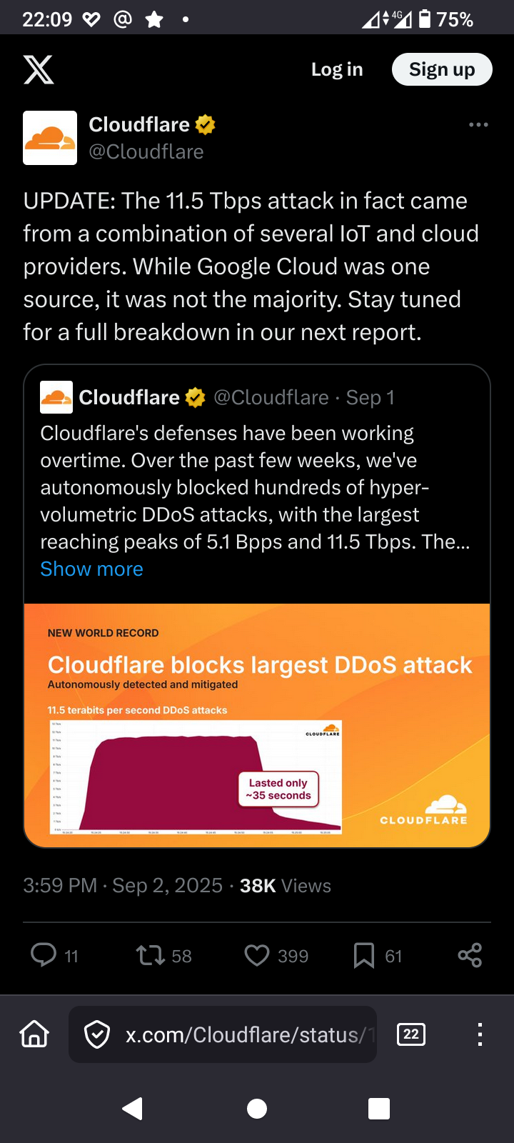 A massive UDP attack sized at 11 and 1/2 terabits was executed at an undisclosed cloudflare client. According to cloudflare the largest DDoS attack mitigated to date