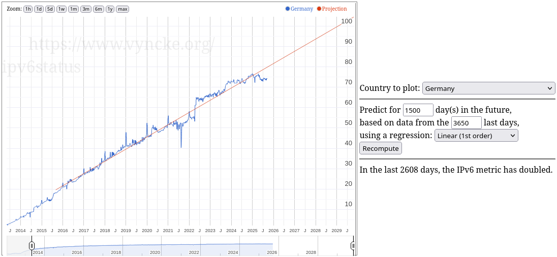 Naja, solange wie das Geschäftsmodell noch hält. Die Preise sind inzwischen auf 20-30 $ pro Adresse gefallen, mit weiter sinkender Tendenz. Wenn wir da einen linearen Abwärtstrend unterstellen, müsste der Preis bereits 2028 bei 0 rauskommen. 2027 - 2029 wären aber auch ungefähr der Zeitpunkt, wo Deutschland, Indien und Frankreich die 100%-Marke (zumindest theoretisch) knacken müssten. Spätestens dann müsste die Nachfrage nach Altadressen einen Sprung nach unten machen. #ipv6