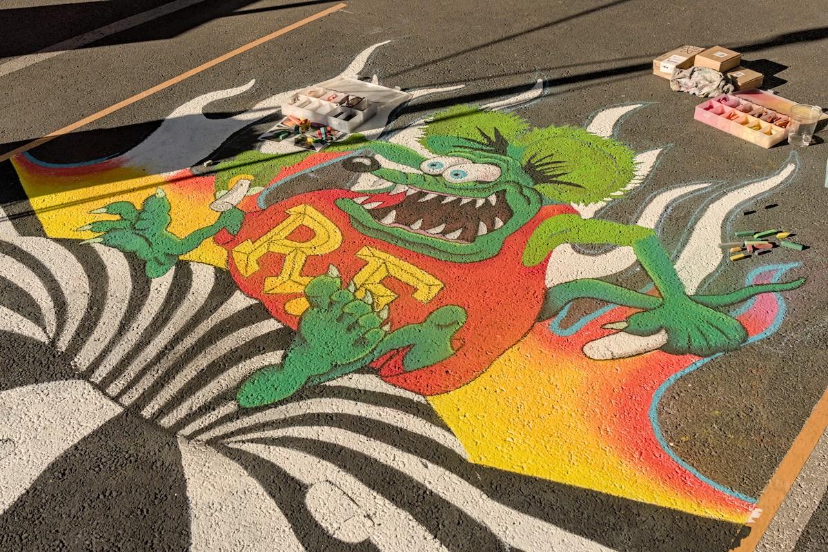 Chalk artist making a Rat Fink! Who remembers who & what Rat Fink is? (Every boy in LA in the '60s had a Rat Fink tee-shirt, that is certain!)