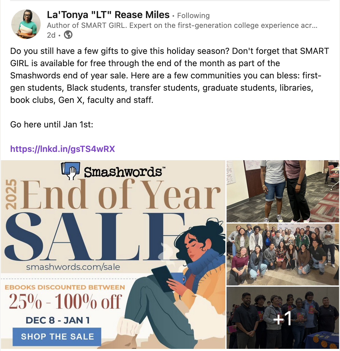 This author is a friend of mine. Check out her book on life as a first generation college grad. Downloadable for free through the end of the year. #bookstodon https://www.smashwords.com/books/view/1801646