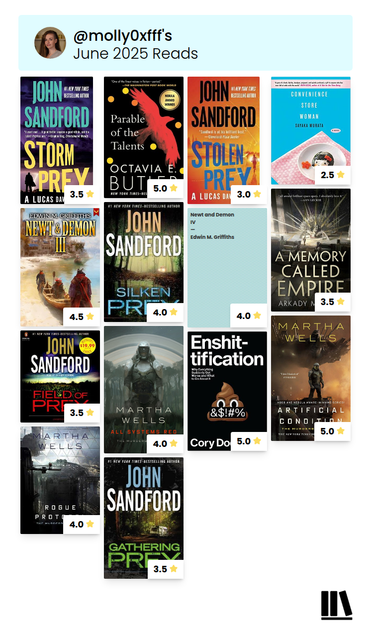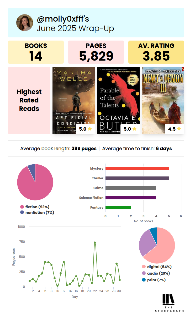So many good books this month, with Octavia Butler’s Parable of the Talents and Martha Wells’ Artificial Condition leading the pack for fiction.