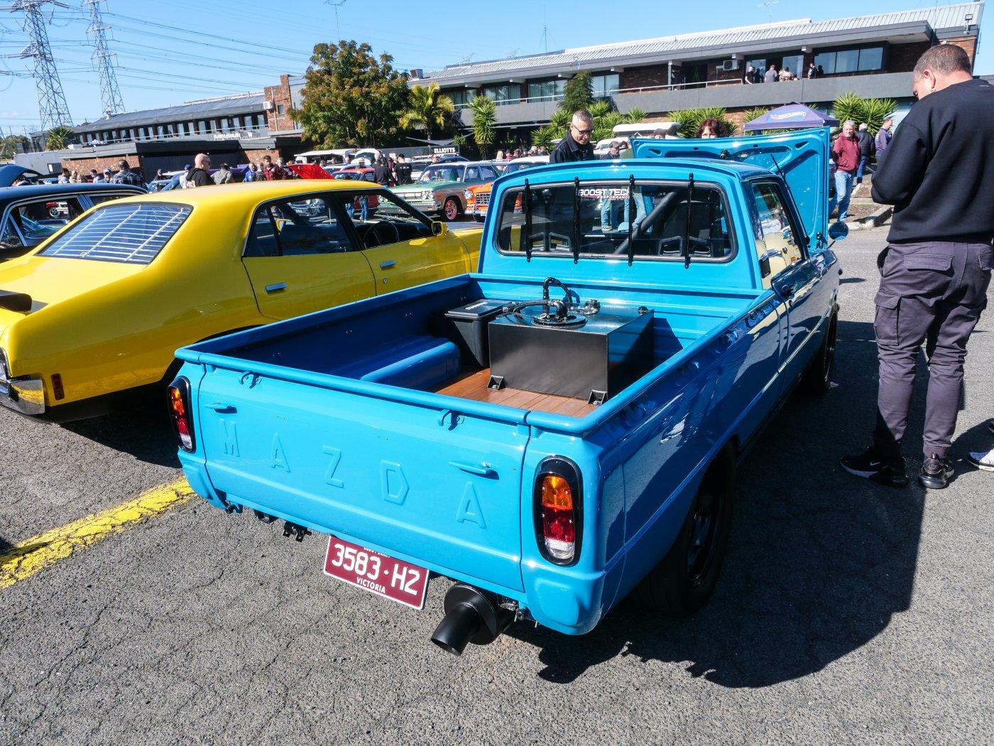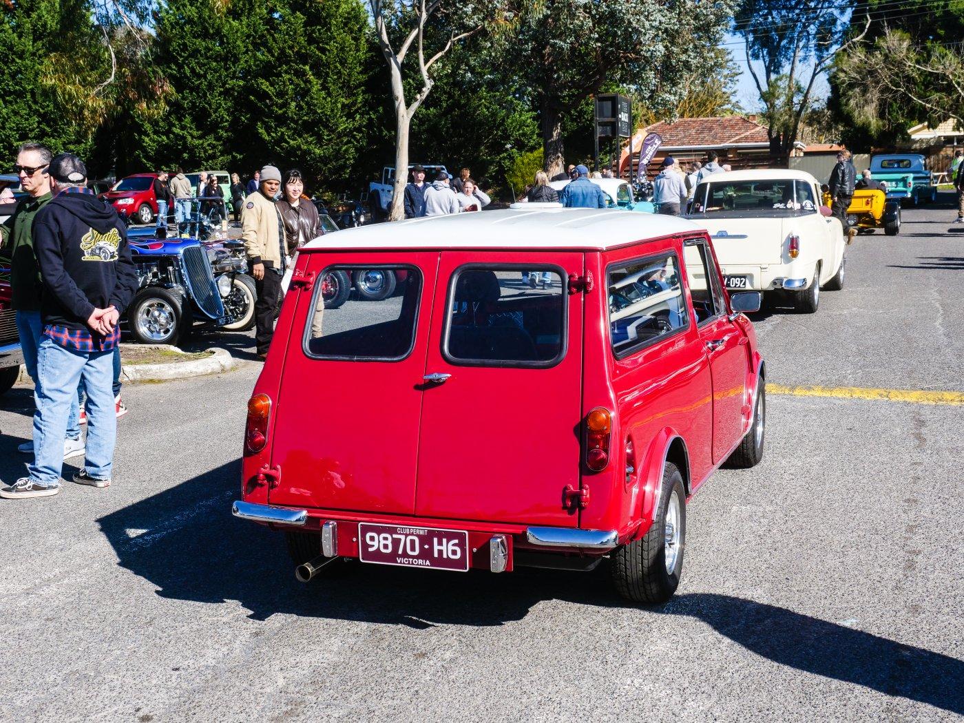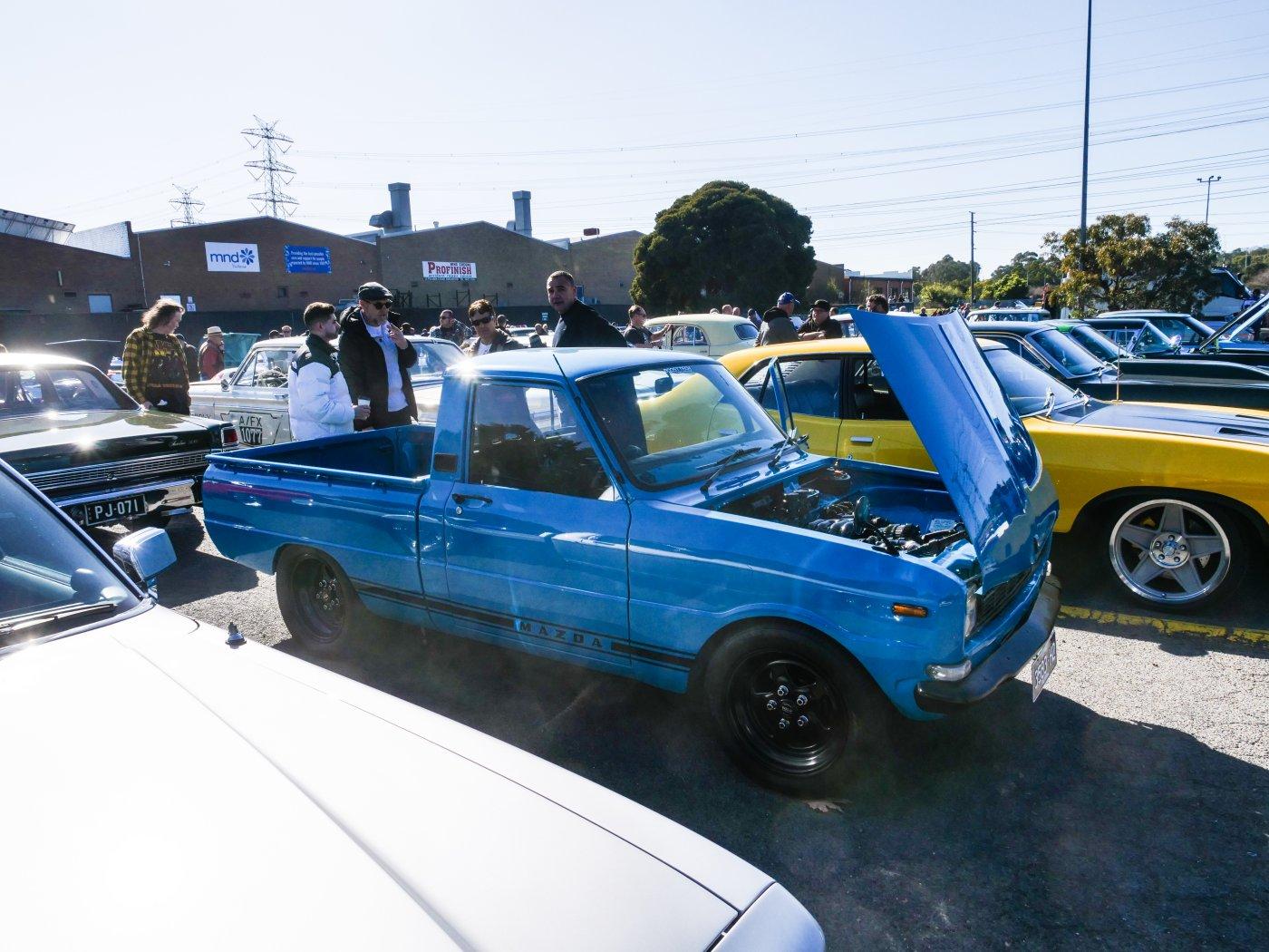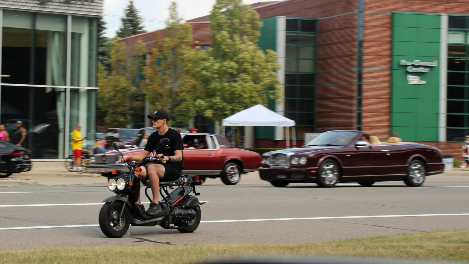 There are no rules about what you can bring to the Dream Cruise. You see all sorts of different cars, including a lot of commuter cars and minivans. Here we have a minibike, a 1980s low rider, and a convertible Bentley all in one group.