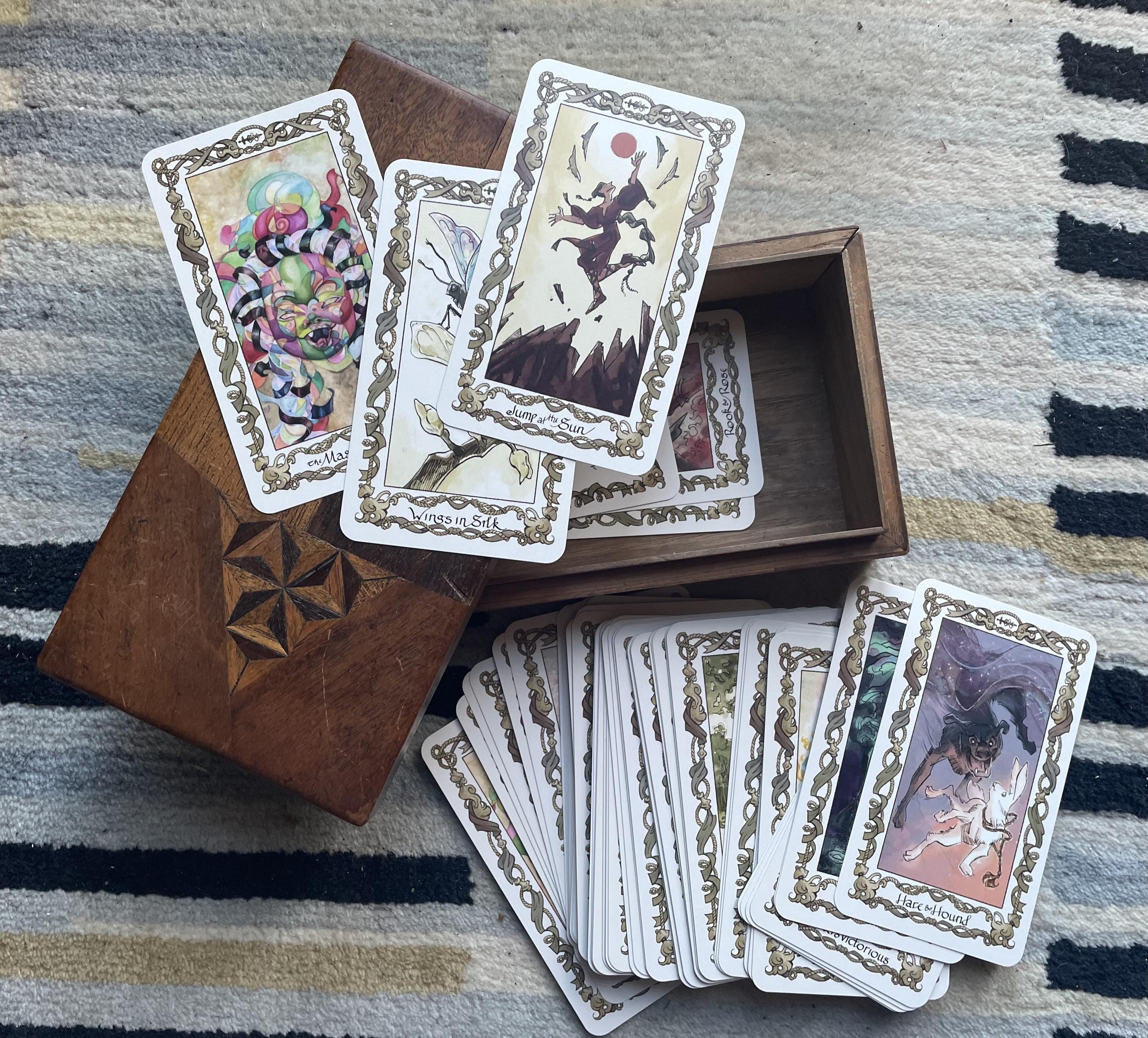 I have my oracle cards from the fabulous #RookAndRose book series (review at https://coffeenow.moomop.uk/post/2025/01/book-reviews-2024/#rook-and-rose-trilogy-by-m-a-carrick) by the writing duo M. A. Carrick (one half of whom is @swan_tower ) and found a vintage box to stash them in while on holiday.