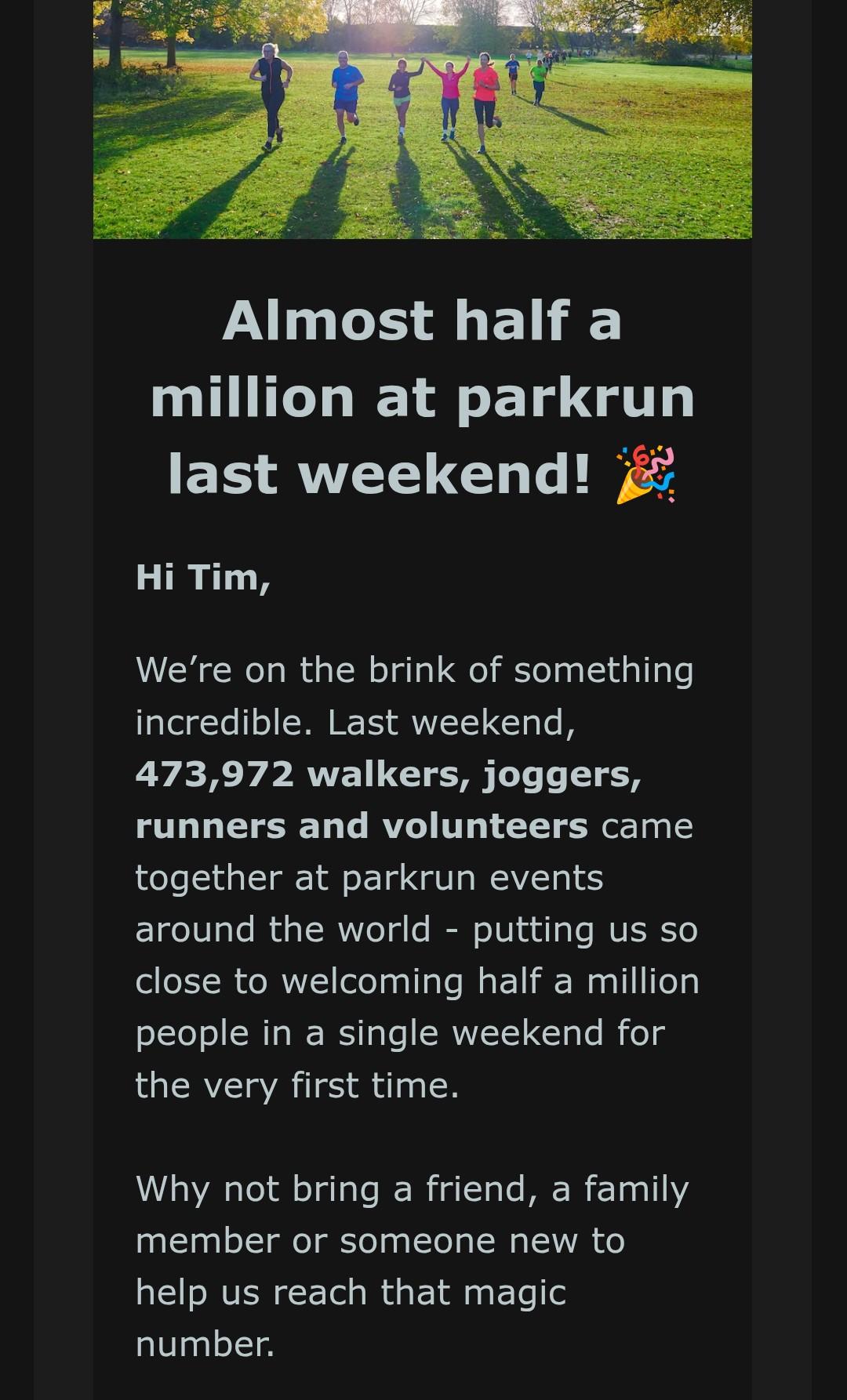 Time to give something back… I’ve just set up a regular donation to #parkrun and reached out to my local one to do some volunteering. I’m hoping to help out at least every three or four weeks which gives me plenty of opportunities to run and helps reduce the chances of cancellations (there have been a couple over the last six months). It will also be really nice to meet some of the team who do the bulk of keeping it all going rather than just wheezing my way past them each time I go.