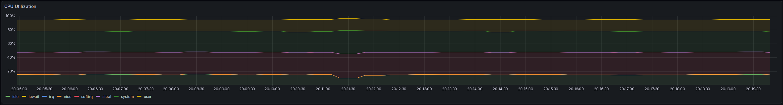 I think I might have finally figured out why my S3 performance is regularly pretty bad. I'm currently copying a 30GB log file into a bucket, and below is the CPU of the Pi 4 on which the Traefik instance fronting the Ceph RGWs is running. I get around 25 MB/s. I think my Pi 4 Homelab might finally become a bit long in the tooth.