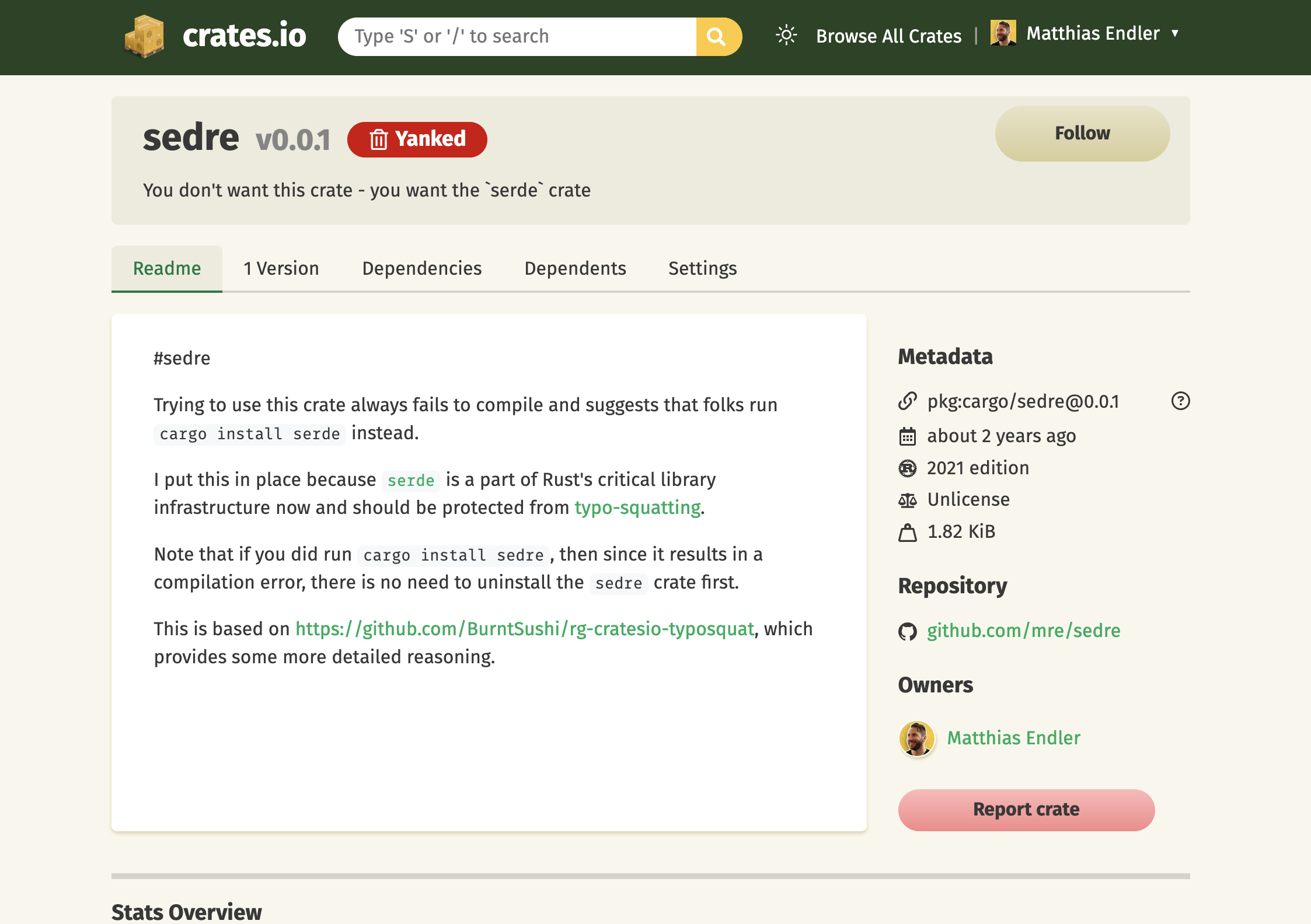 I once mistyped `serde` as `sedre` and thought, "oh boy, that's a simple mistake to make. What if someone registered the crate and put malicious code in it?"